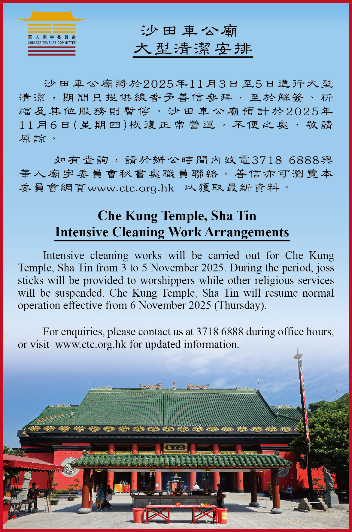 Intensive cleaning works will be carried out for Che Kung Temple, Sha Tin from 3 to 5 November 2025. During the period, joss sticks will be provided to worshippers while other religious services will be suspended. Che Kung Temple, Sha Tin will resume normal operation effective from 6 November 2025 (Thursday). For enquiries, please contact us at 3718 6888 during office hours, or visit our website for the latest information.