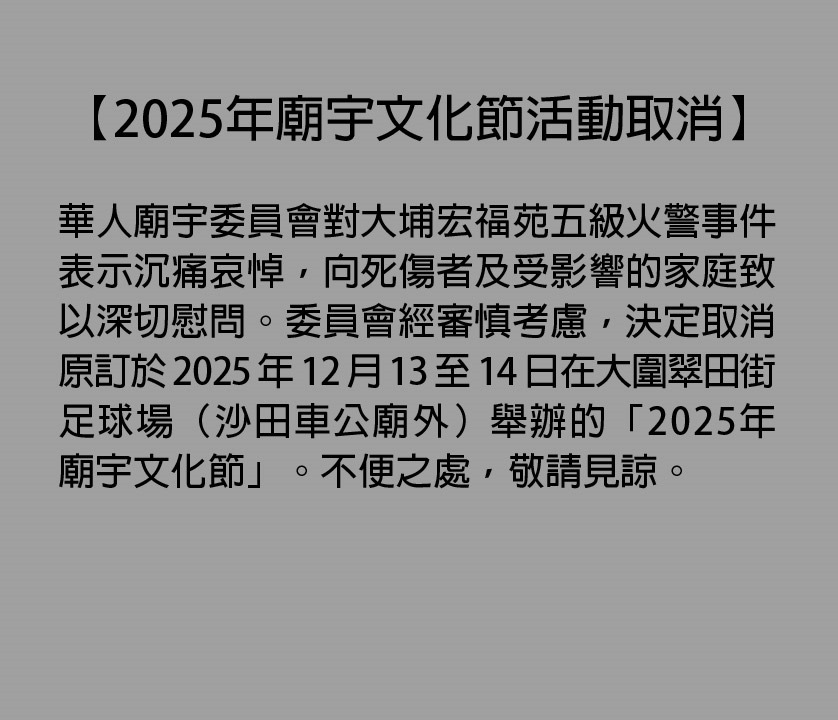 華人廟宇委員會對大埔宏福苑五級火警事件表示沉痛哀悼,向死傷者及受影響的家庭致以深切慰問。委員會經審慎考慮,決定取消原訂於 2025 年 12 月 13 至 14 日在大圍翠田街足球場(沙田車公廟外)舉辦的「2025年廟宇文化節」。不便之處,敬請見諒。