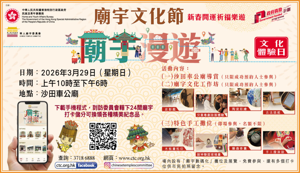 - 場內設有「廟宇數碼化」攤位及展覽,免費參與,還有多個打卡位供市民拍照留念。