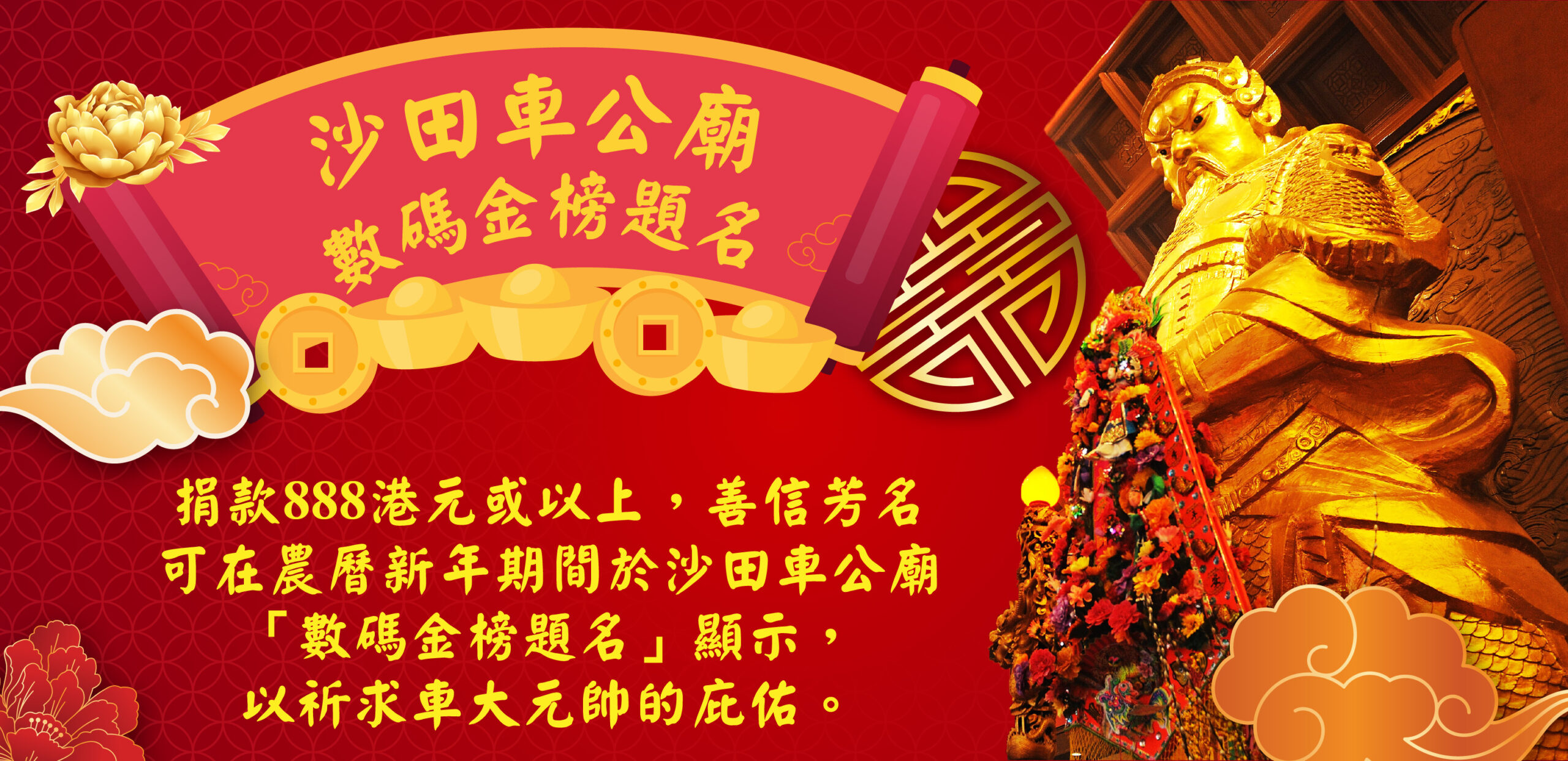 沙田車公廟農曆新年數碼金榜題名 祈求車大元帥庇佑 - 只需捐款888港元或以上,善信芳名及捐款金額便可於2026年農曆新年期間 (正月)於沙田車公廟車大元帥旁的「數碼金榜題名」顯示屏以走字形式連續顯示 8日,以祈求車大元帥的庇佑。