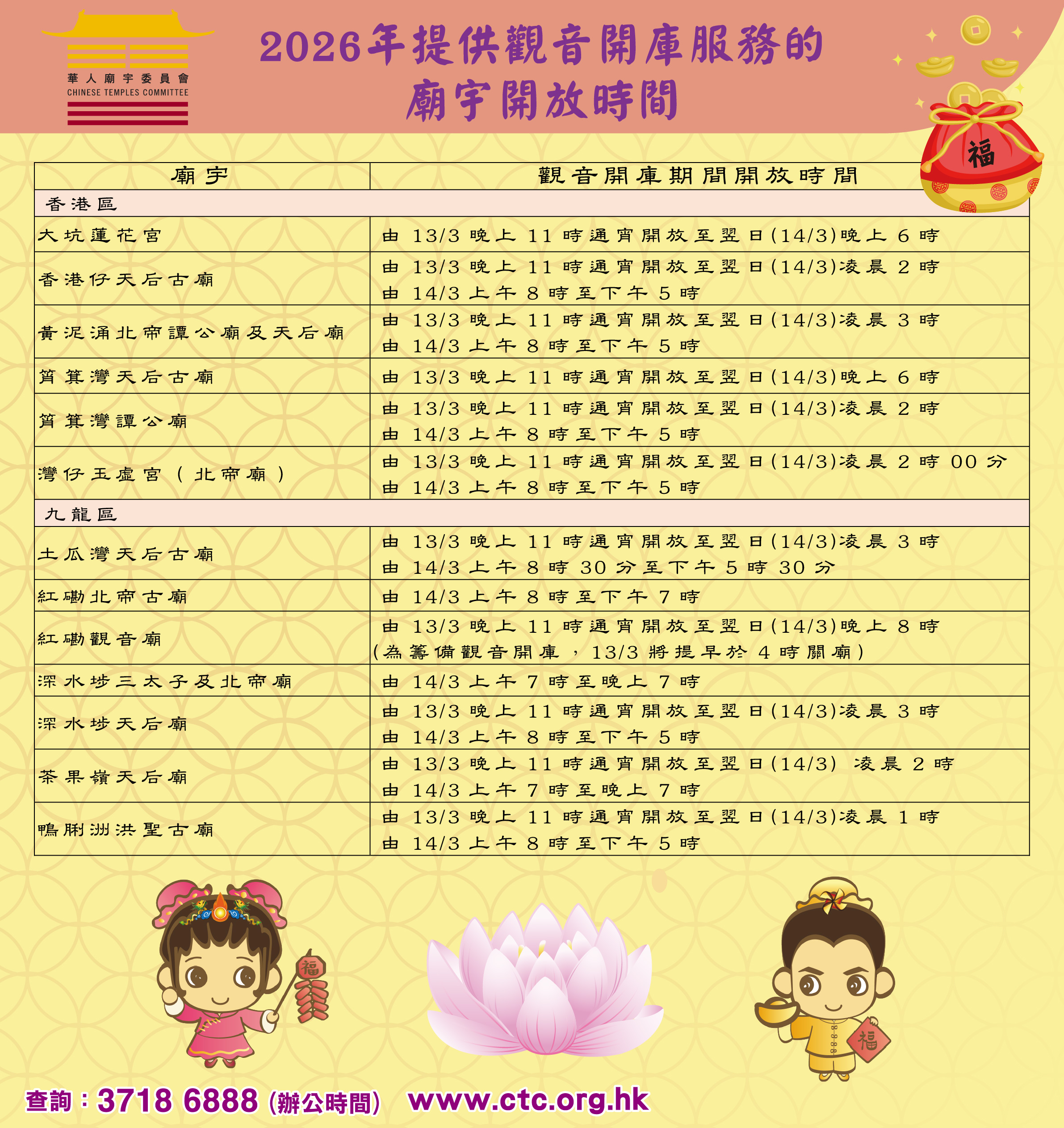 华人庙宇委员会辖下庙宇 2026年农历新年期间特别开放时间