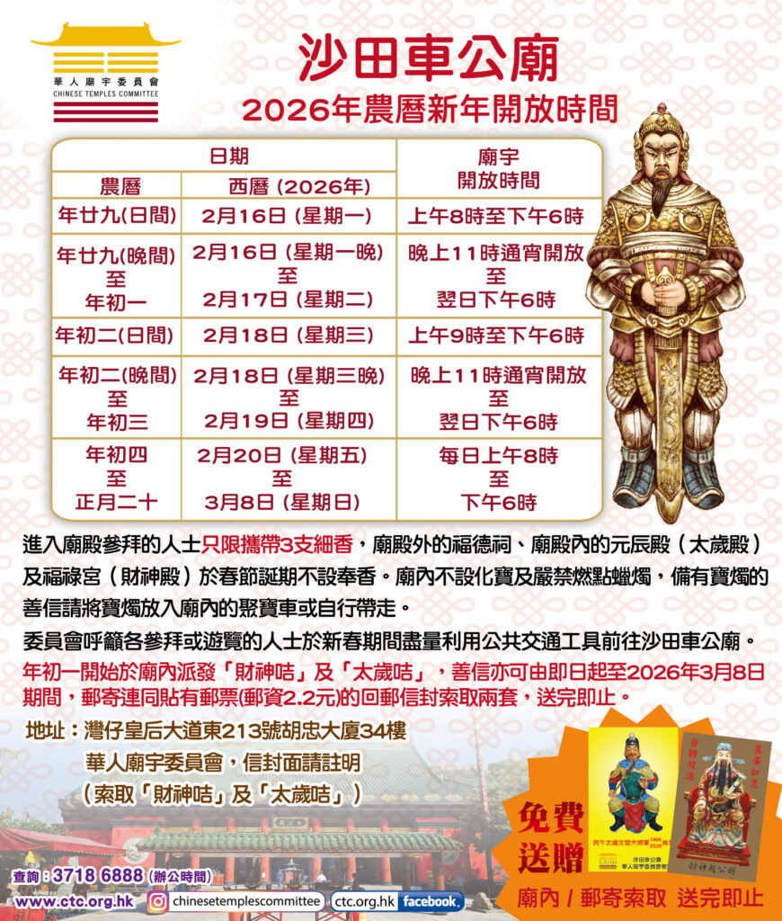 2026年沙田车公庙车公诞及农历新年期间的特别开放时间