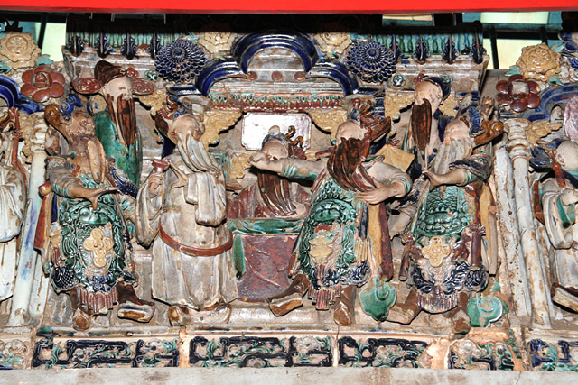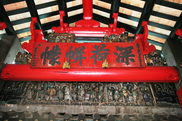 Parapet walls (a barrier which is an extension of the wall at the edge of a roof, terrace, walkway or other structure) at the side of courtyard are widely decorated with exquisite Shiwan ceramic figurines. A vertical plaque marked “King of Hung Shing Kwan Li” is hanged above the entrance of main hall. There are another 2 plaques hang in the left and right sides of the pavilion respectively. They express the gratitude towards Hung Shing.